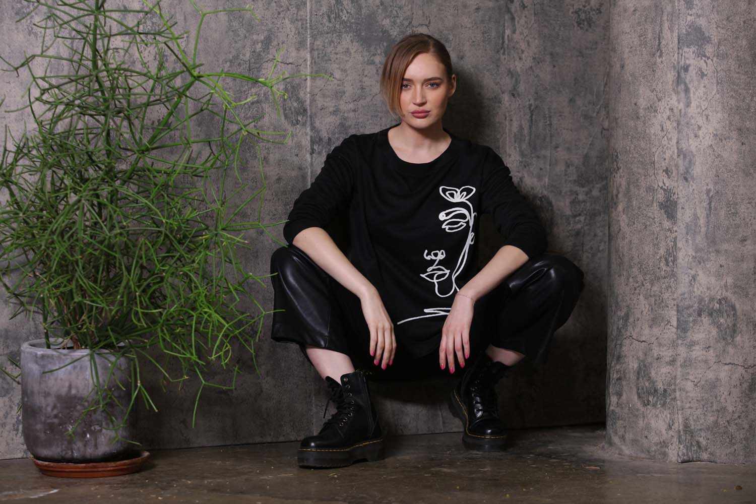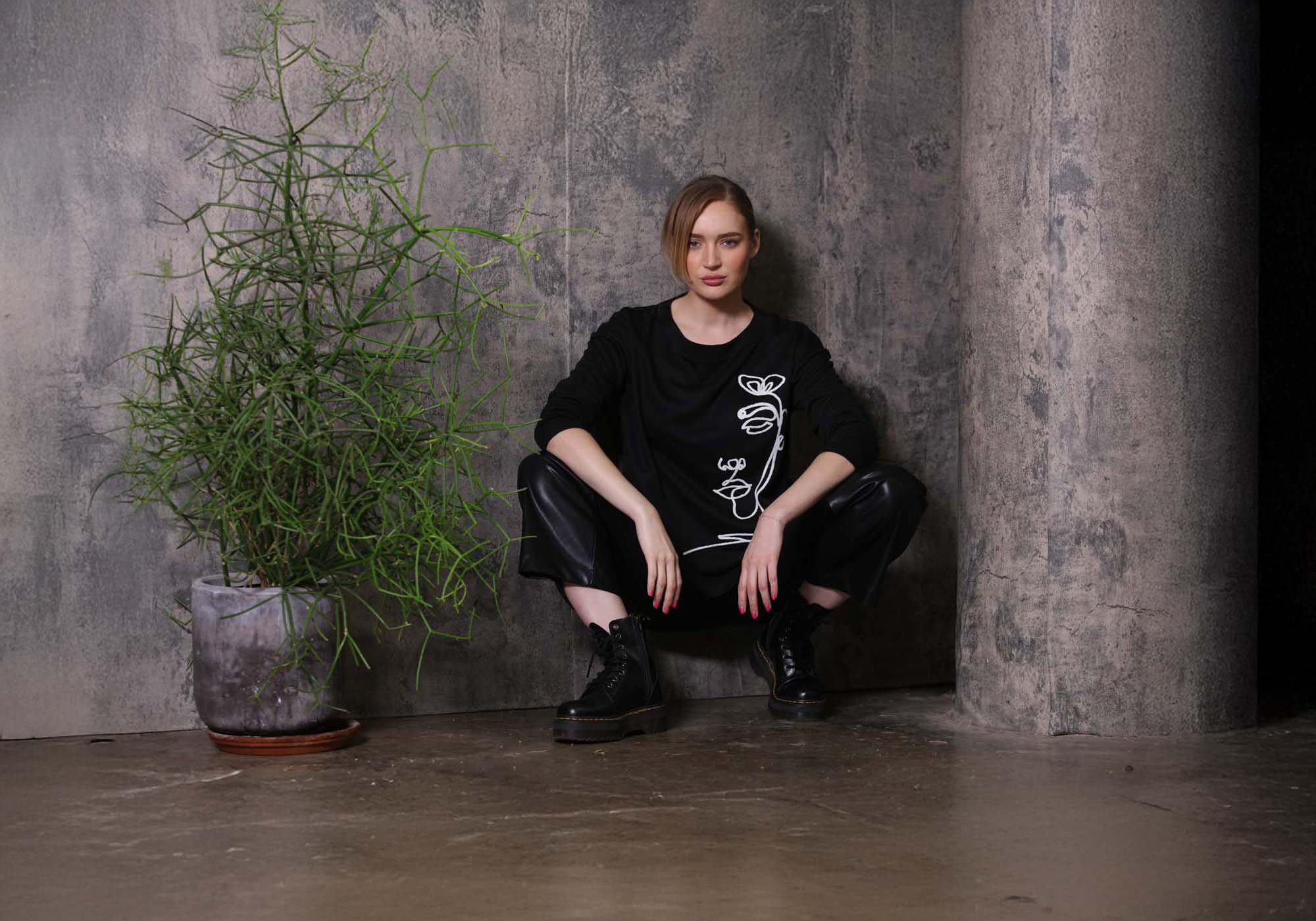 T2632 oversized tunic with a bold black and white abstract print.
